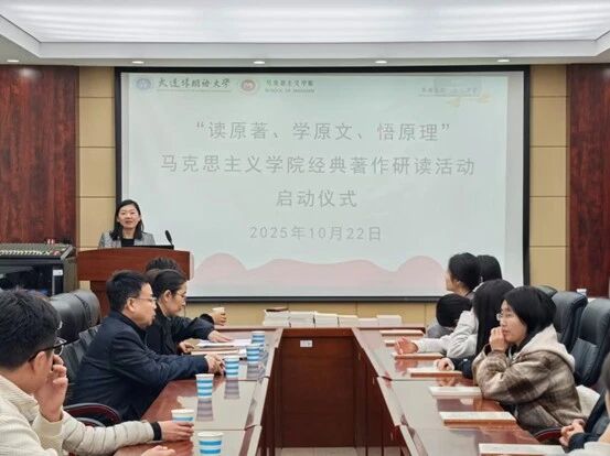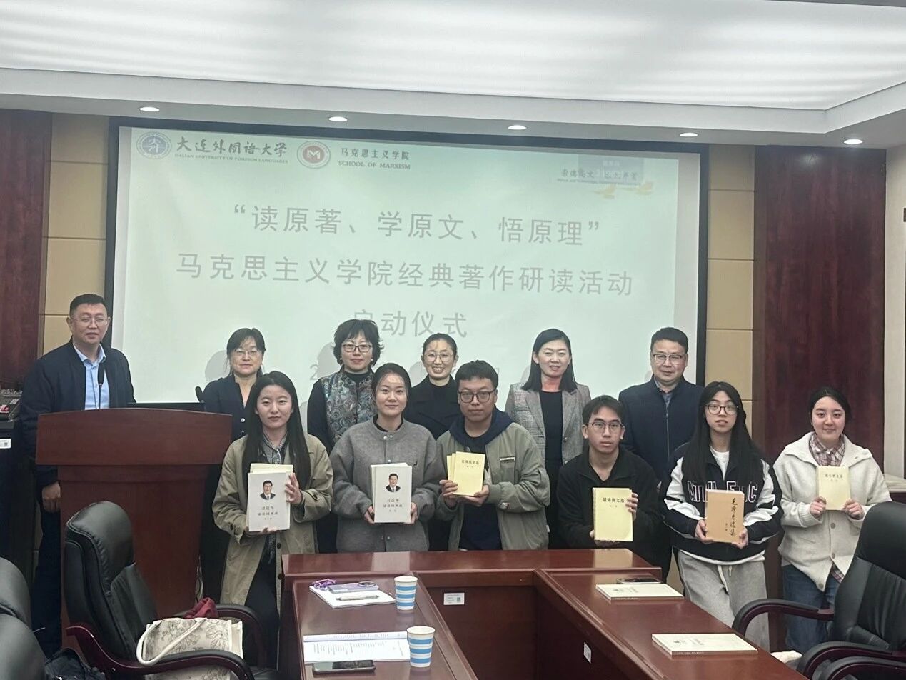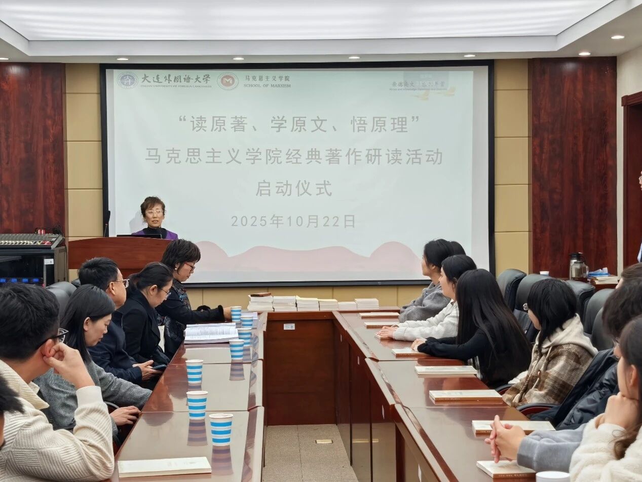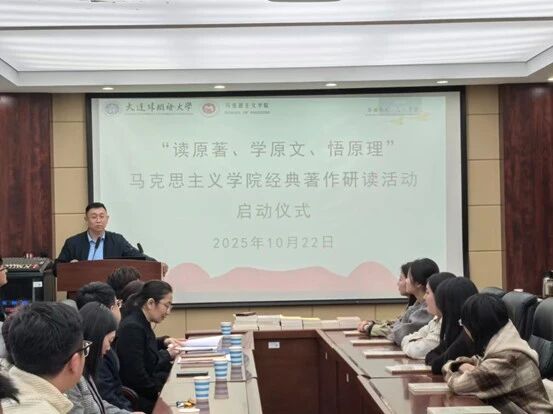 为深入贯彻落实党的二十大和二十届三中、四中全会精神,进一步提升学生马克思主义理论素养,培养研究生对马克思主义经典著作的研究能力,大连外国语大学马克思主义学院于10月22日下午举办“读原著、学原文、悟原理”马克思主义学院经典著作研读活动启动仪式”。本次活动由马克思主义学院副院长张雷主持,董杨副院长、李晓溪副书记、张艳宏教授、杨立国教授、刘昱教授、冯茹教授及2024级、2025级研究生参加。