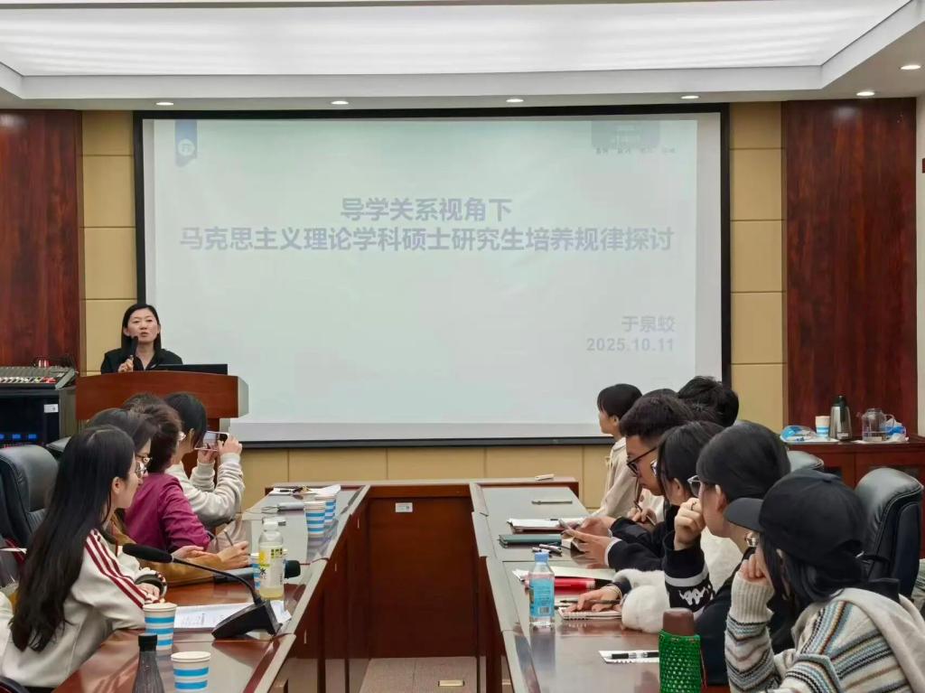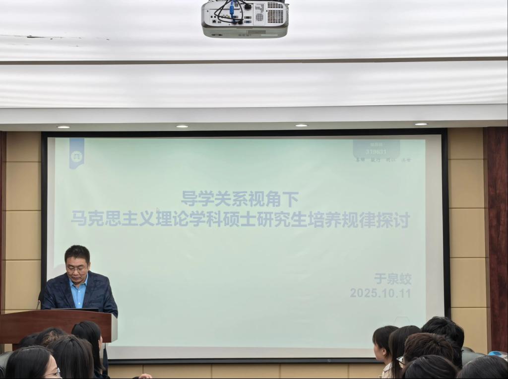 于泉蛟教授在马克思主义理论学科研究生培养方面有着独到的见解和深入的研究。讲座一开始,于泉蛟教授首先明确了马克思主义理论学科研究生培养的总目标。他强调了要坚持“立德树人”,要培养政治坚定、理论扎实、能力突出、素质全面,担当民族复兴大任的时代新人;也要为党的理论事业、国家现代化建设以及繁荣发展输送合格的建设者和可靠的接班人。并进一步从政治信念目标、道德品质目标、理论目标、专业知识目标、相关学科知识目标、科研创新能力目标、理论运用与社会实践能力目标、思政课教学能力目标以及科学研究能力目标九个方面,详细阐述了马克思主义理论学科研究生学习的核心在于“信仰坚定、理论扎实、能力突出、德才兼备”。研究生培养不仅仅是为了传授知识,更是为了培养马克思主义的传承者、研究者和践行者,为党和国家事业发展输送高层次的理论人才和工作者。因此,整个培养过程都注重理论联系实际,做到思想政治素质和专业能力的统一。